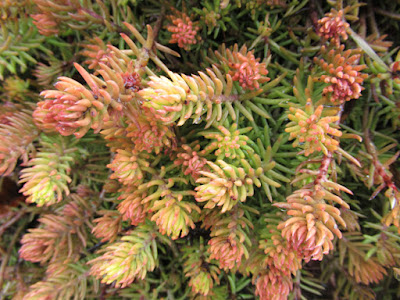 Sedum reflexum är en krypande, tålig växt som tycker om torra ställen. Jag har en sort som går i gult med tillnamnet "Angelina". Nu på våren har den även röda färger.
