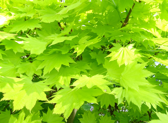 Vid dammen lyser min lilla solfjäderslönn/Acer shirasawanum "Aureum". En lönn som växer någon decimeter varje år, lite lagom för speciella platser.